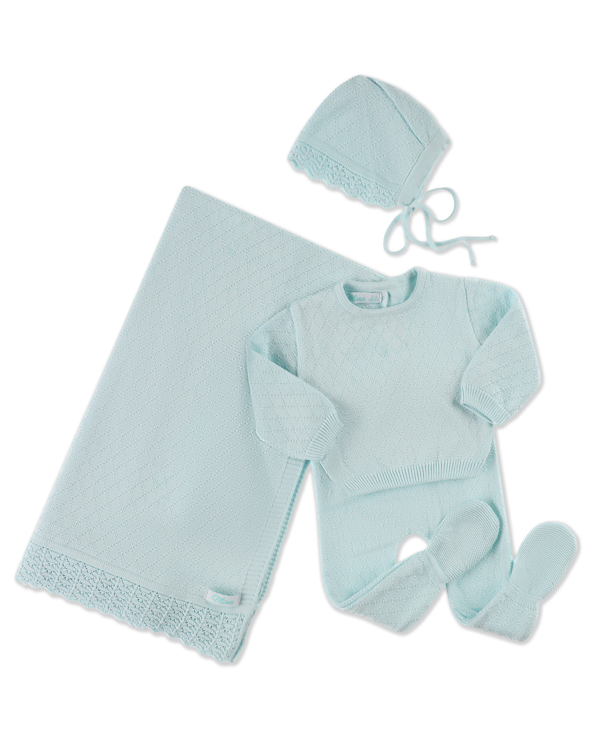 סט חלומי הכולל חולצה ומכנס עם רגליות, שמיכה וכובע בונט תואמים – סריגה רכה, יוקרתית ונעימה למגע.